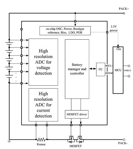 HSM12X0 系列芯片可作為3-15 節(jié)串聯(lián)電池組監(jiān)控和保護(hù)解決方案的一部分。通過I2C 通信,MCU 可以使用HSM12X0 來(lái)執(zhí)行電池管理功能,例如監(jiān)測(cè)(電池電壓、電池組電流、電池組溫度)、保護(hù)(控制充電/放電FET)以及電池組均衡功能等。集成的模數(shù)轉(zhuǎn)換器可實(shí)現(xiàn)MCU 對(duì)電池組關(guān)鍵參數(shù)(電壓、電流以及溫度)的純數(shù)字讀取,這些參數(shù)的校準(zhǔn)在制造過程中處理。HSM12X0 在設(shè)計(jì)時(shí)充分考慮了低功耗要求,既可通過使能/禁用集成電路IC 中的子模塊來(lái)控制整個(gè)芯片的功耗,又可以利用SHIP 模式將電池組切換至超低功耗狀態(tài)。