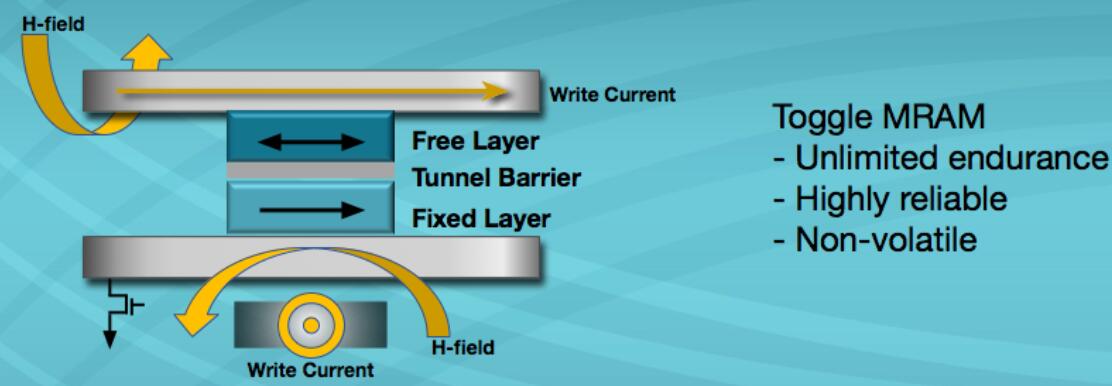 切換MRAM使用1個晶體管,1個MTJ單元來提供簡單的高密度存儲器。Everspin使用獲得專利的Toggle電池設計,可提供高可靠性。數據在溫度下20年始終是非易失性的。