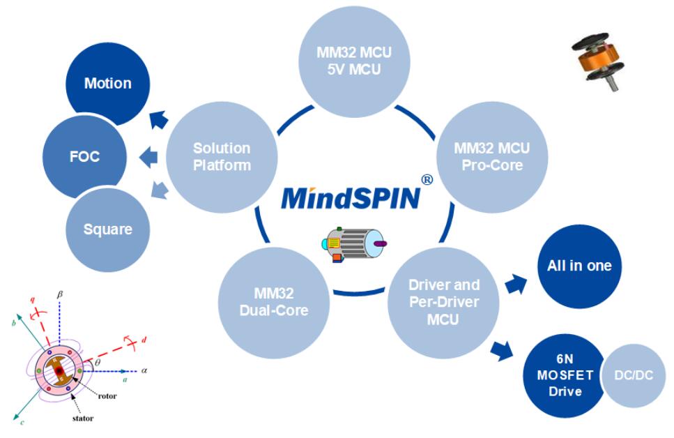 SPIN是旋轉(zhuǎn)的同義詞,再注入靈動微電子的靈魂Mind,表示靈活與專業(yè)。包含了三大主軸:專業(yè)MCU,專用驅(qū)動MCU微控制器及解決方案平臺。專用MCU的獨特之處是帶領(lǐng)了許多主流應(yīng)用,如:電動車的應(yīng)用,目前市場的占有率仍然保持領(lǐng)先地位;專用驅(qū)動型MCU微控制器電壓范圍從20V至600V。例:MM32SPIN222C集成了三相MOSFET、預(yù)驅(qū)以及LDO,可讓小空間發(fā)揮最大的功能,同時內(nèi)建了高性能32位的Arm Cortex-M0內(nèi)核為運算核心,讓開發(fā)更為簡單快捷;解決方案平臺由擁有超過10年以上算法開發(fā)經(jīng)驗的MindSPIN團(tuán)隊精心打造,按技術(shù)方式分為方波、旋波FOC以及位置控制三類,按應(yīng)用方式可分為風(fēng)機、電動工具、微電機、家電以及電動車五大類,同時靈動微電子還提供了不同的相對應(yīng)的特色