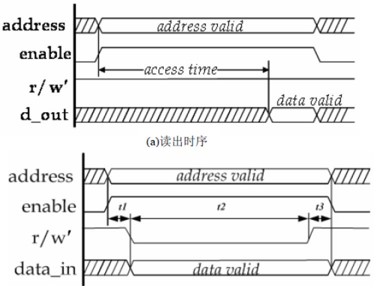 SRAM存儲器的讀寫時序。在讀出操作中,訪問時間(access time)就是指從地址有效算起,到有效數據輸出的時間;圖1.4 (b)中t1 是從地址和使能信號穩定到寫信號有效所需的最小時間,t2 是寫信號無效之前必須保持的最小時間,t3是寫信號無效之后地址信號仍需保持的最小時間。t1、t2、t3 相加就是一個寫周期時間。
